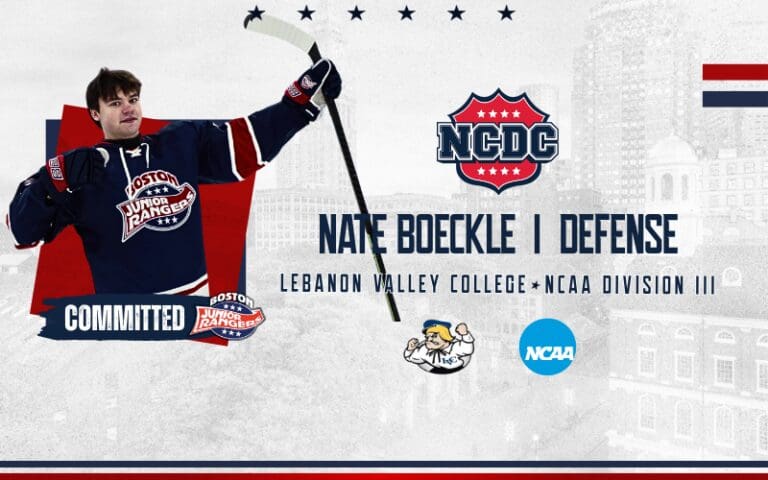 The NCDC congratulates Nate Boeckle on his commitment to Lebanon Valley College and thanks him for his contributions to the Boston Jr. Rangers. The Rangers organization wishes Nate continued success on and off the ice.
